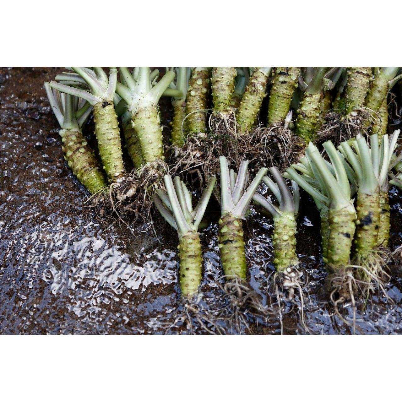 The wasabi horseradish is cultivated in the manufacturer's wasabi garden at the foot of Mt. Amagi which is in Izu, Shizuoka. This place is famous for producing quality wasabi because of its clear and nutritious spring water.