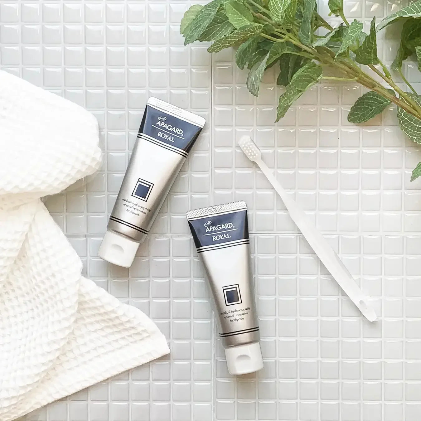 Compared to Apagard M-Plus Toothpaste, Apagard Royal contains 2 times more nano mHAP. It also features liquid conchiolin, a pearl ingredient for added luster, and gloss.